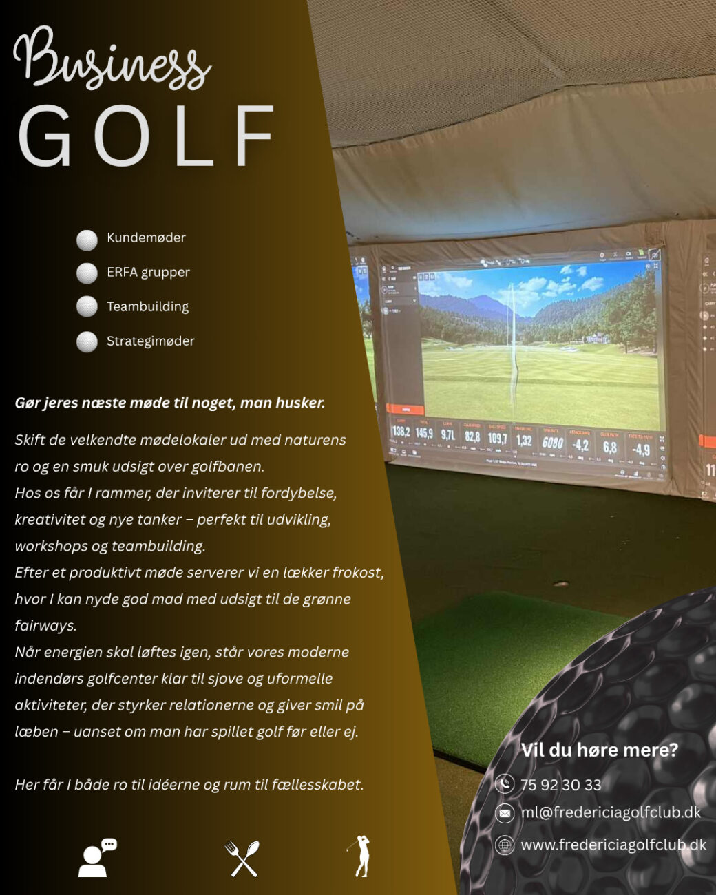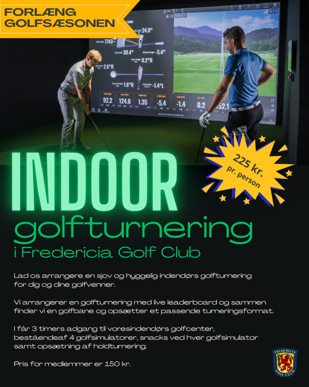 Som medlem af Fredericia Golf Club har du adgang hele året til klubbens 240 kvm. store indendørs og handicapvenlige golfcenter. Centeret består af 4 stk. Trackman4 golfsimulatorer, putting green, indendørs range samt opholdsrum.